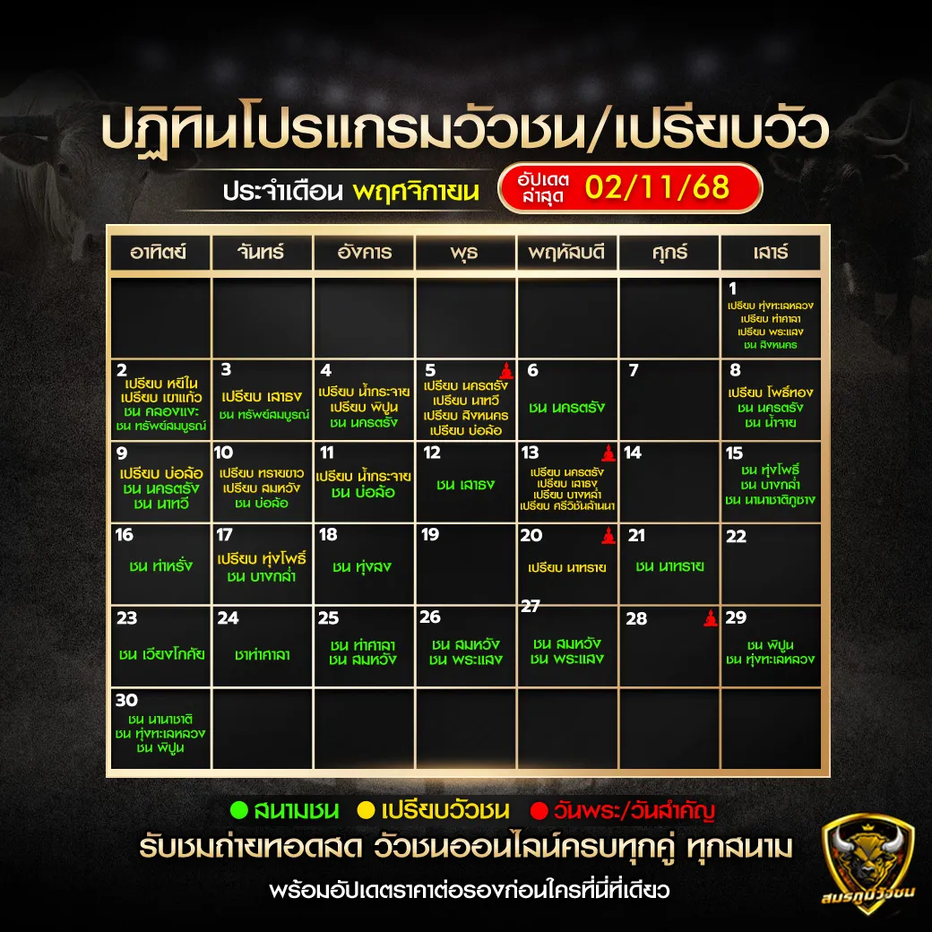 โปรแกรมวัวชนประจำวัน พร้อมเรตราคา อัตราต่อรอง และคู่เอก