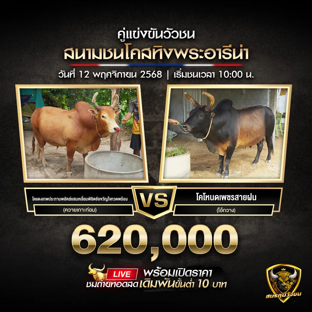 เตรียมพบกับการแข่งขันกีฬาวัวชนสุดยิ่งใหญ่แห่งปีกับ โปรแกรมวัวชน วันที่ 12 พฤศจิกายน 2568 ที่จะจัดขึ้นในสองสนามยอดนิยมของวงการ ได้แก่ สนามชนโคสทิงพระอารีน่า งานนี้มีวัวชนชื่อดังจากทั่วประเทศเข้าร่วมประชันความแข็งแกร่ง โดยแต่ละคู่ต่างเต็มไปด้วยนักสู้สายพันธุ์ดี ที่พร้อมสร้างตำนานหน้าใหม่ให้กับวงการวัวชนไทย ! อย่าพลาดโอกาสในการชมการแข่งขันสดสุดมันส์