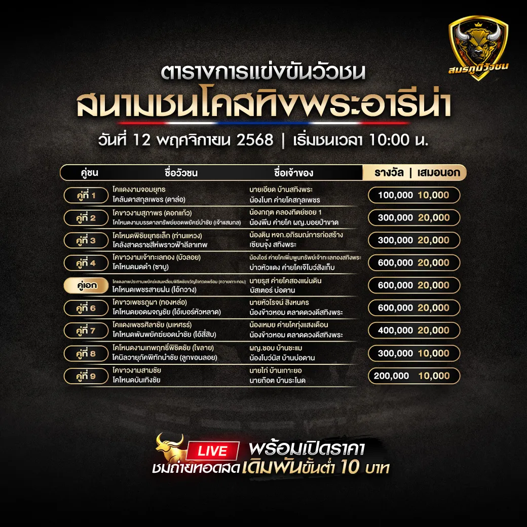 โปรแกรมวัวชน สนามชนโคสทิงพระอารีน่า วันที่ 12 พฤศจิกายน 2568