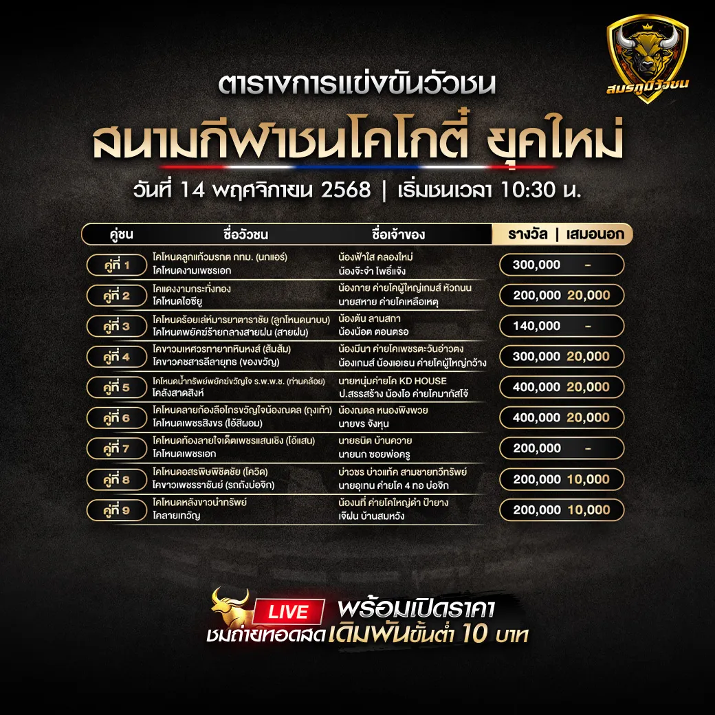โปรแกรมวัวชน สนามชนโคโกตี้ยุคใหม่ วันที่ 14 พฤศจิกายน 2568