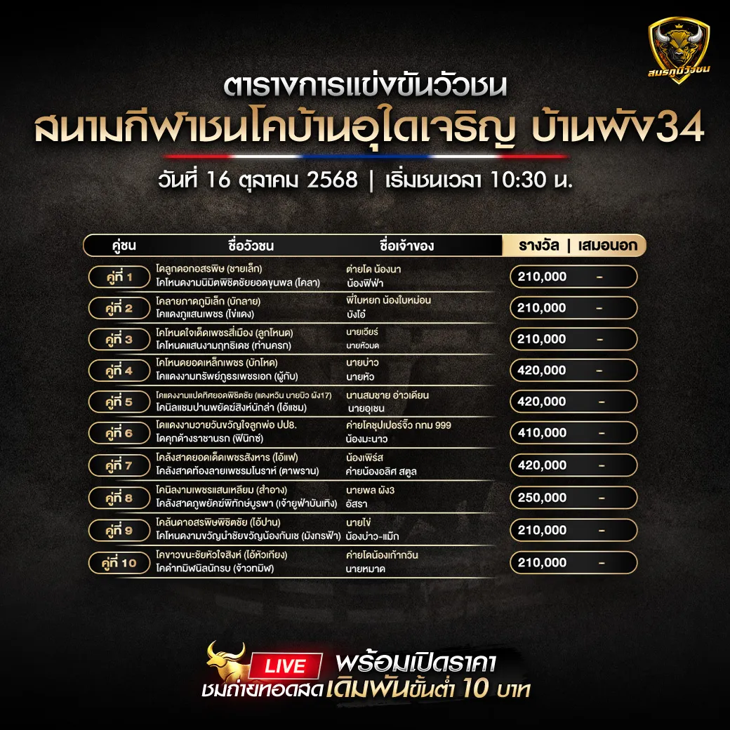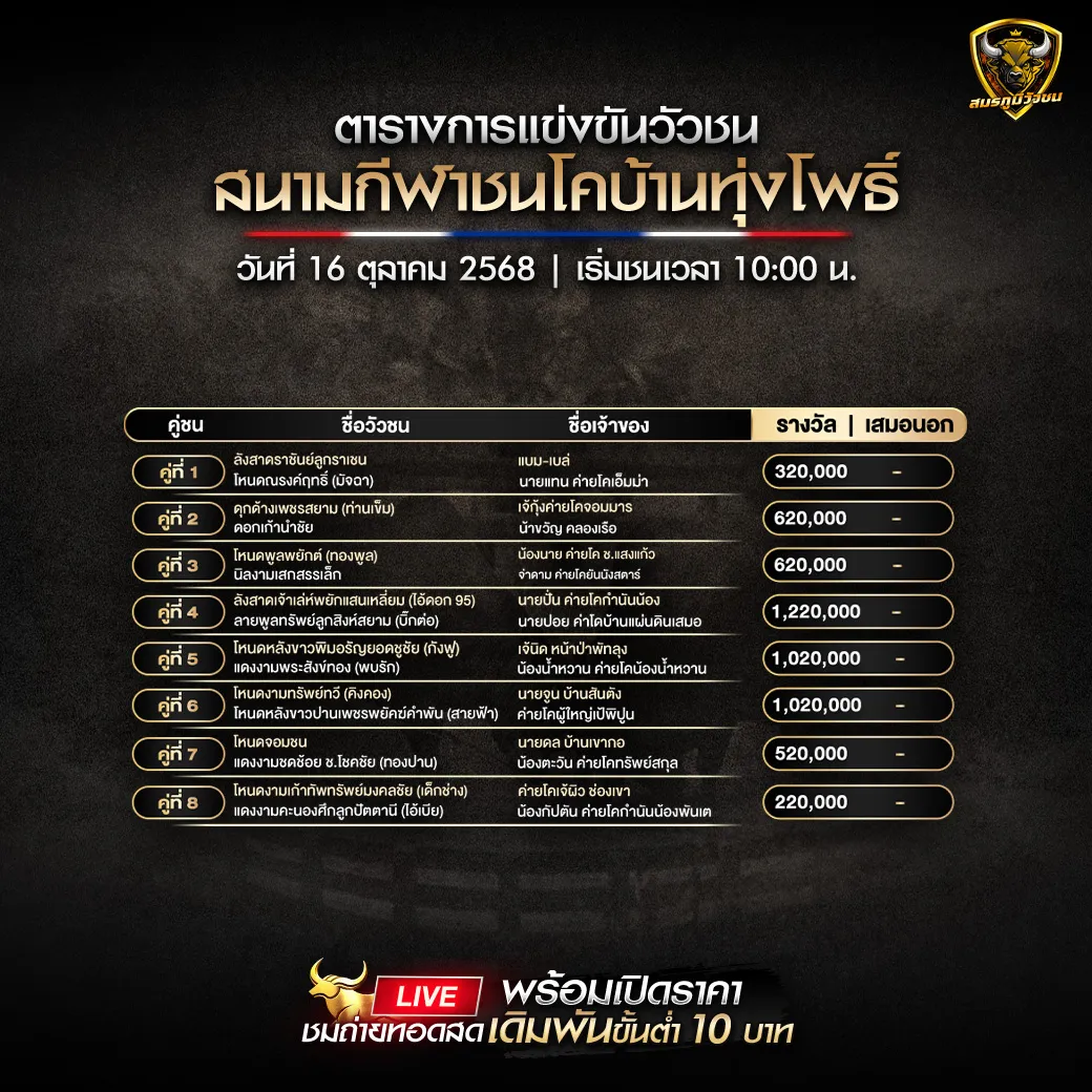 โปรแกรมวัวชน วันที่ 16 ตุลาคม 2568