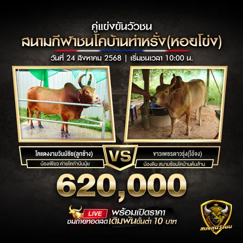 เตรียมพบกับการแข่งขันกีฬาวัวชนสุดยิ่งใหญ่แห่งปีกับ โปรแกรมวัวชน วันที่ 24 สิงหาคม 2568 ที่จะจัดขึ้นในสองสนามยอดนิยมของวงการ ได้แก่ สนามกีฬาชนโคบ้านท่าหรั่ง(หอยโข่ง) , สนามกีฬาชนโคทรัพย์สมบูรณ์ งานนี้มีวัวชนชื่อดังจากทั่วประเทศเข้าร่วมประชันความแข็งแกร่ง โดยแต่ละคู่ต่างเต็มไปด้วยนักสู้สายพันธุ์ดี ที่พร้อมสร้างตำนานหน้าใหม่ให้กับวงการวัวชนไทย ! อย่าพลาดโอกาสในการชมการแข่งขันสดสุดมันส์