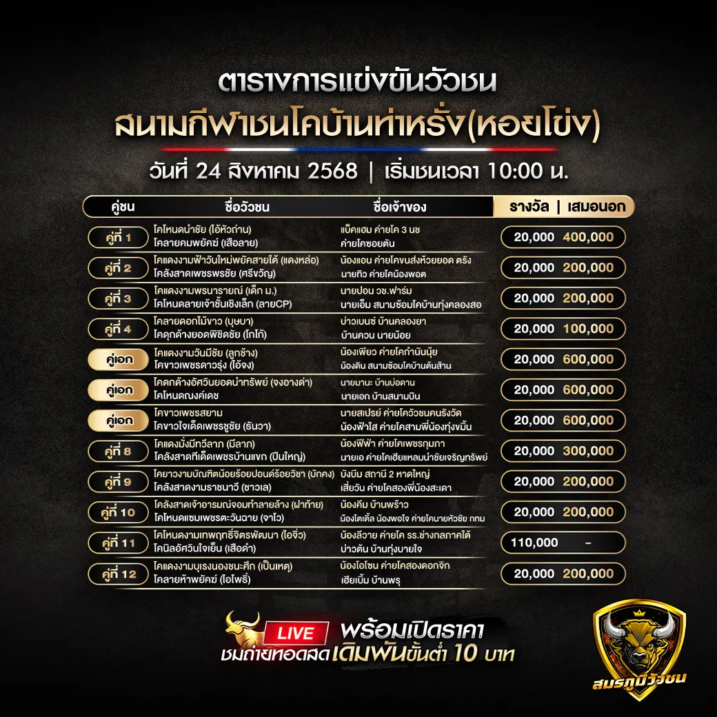 โปรแกรมวัวชน สนามกีฬาชนโคบ้านท่าหรั่ง(หอยโข่ง) วันที่ 24 สิงหาคม 2568