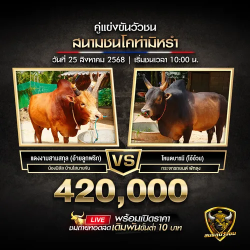 เตรียมพบกับการแข่งขันกีฬาวัวชนสุดยิ่งใหญ่แห่งปีกับ โปรแกรมวัวชน วันที่ 25 สิงหาคม 2568 ที่จะจัดขึ้นในสองสนามยอดนิยมของวงการ ได้แก่ สนามกีฬาชนโคบ้านท่ามิหรำ , สนามกีฬาชนโคกระบี่(ไร้ใหญ่) งานนี้มีวัวชนชื่อดังจากทั่วประเทศเข้าร่วมประชันความแข็งแกร่ง โดยแต่ละคู่ต่างเต็มไปด้วยนักสู้สายพันธุ์ดี ที่พร้อมสร้างตำนานหน้าใหม่ให้กับวงการวัวชนไทย ! อย่าพลาดโอกาสในการชมการแข่งขันสดสุดมันส์