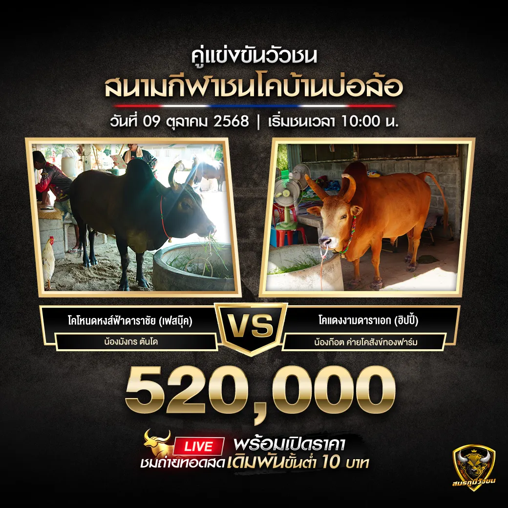 เตรียมพบกับการแข่งขันกีฬาวัวชนสุดยิ่งใหญ่แห่งปีกับ โปรแกรมวัวชน วันที่ 9 ตุลาคม 2568 ที่จะจัดขึ้นในสองสนามยอดนิยมของวงการ ได้แก่ สนามชนโคบ้านบ่อล้อ งานนี้มีวัวชนชื่อดังจากทั่วประเทศเข้าร่วมประชันความแข็งแกร่ง โดยแต่ละคู่ต่างเต็มไปด้วยนักสู้สายพันธุ์ดี ที่พร้อมสร้างตำนานหน้าใหม่ให้กับวงการวัวชนไทย ! อย่าพลาดโอกาสในการชมการแข่งขันสดสุดมันส์
