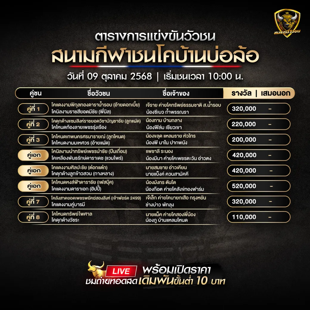 โปรแกรมวัวชน วันที่ 9 ตุลาคม 2568
